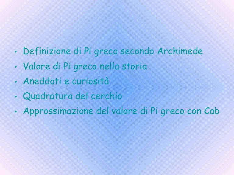 Il coseno di 180 gradi è uguale a -1 e si indica con cos180. La misura della circonferenza di un cerchio si trova con la formula C πd 2πr. Il calcolo di Pi greco Luca Simon e Roberto Carrer Questo esempio si propone di calcolare il valore di π usando il metodo di integrazione numerica. Il pi greco mathpi math è una costante matematica che è strettamente legata alla circonferenza poiché definita come il rapporto tra il perimetro del cerchio e il suo diametro.